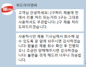 제품 회수는 택배 기사님이 직접 방문해 수거해 간다고 합니다. 안내받은 내용에 따르면, 문 앞에 제품을 내놓으면 되고, 환불은 회수 확인 후에 진행된다고 했습니다. 개인적으로는 교환을 원했는데, 현재는 환불만 가능하다고 해서 아쉬움이 남습니다.