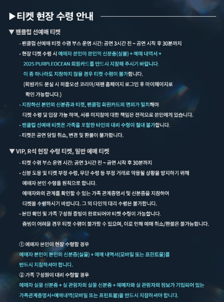 VIP, R석은 현장 수령이 원칙이라 선예매 때도 신분증을 반드시 지참해야 한다.