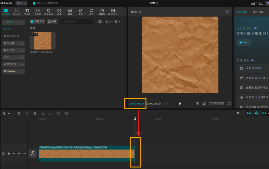 방법 1: 이미지(사진) 가져오면 기본 5초로 설정 되어있음 → 타임라인 앞부분 끝에서 길이 조절