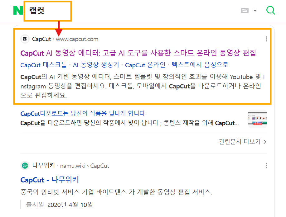 검색창에 "캡컷"이라고 타이핑합니다. → 캡컷 클릭 → 무료 다운로드 클릭 → 다운로드 → 캡컷 설치프로그램 더블클릭(설치완료)