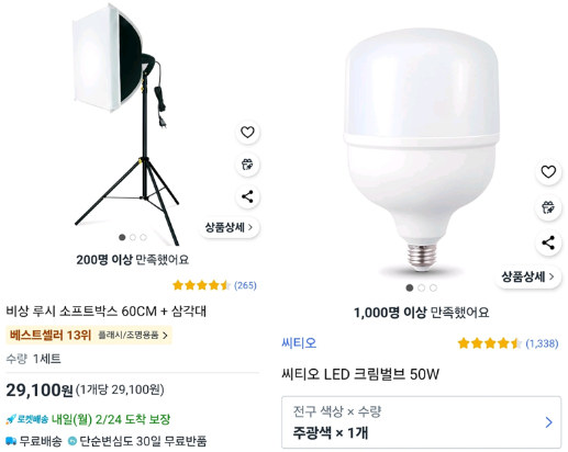 1, 2번 두 가지를 구입했습니다. 1번은 조명등이 포함되어 있지 않았기에 쿠O에서 함께 구입하면 좋은 물품 추천을 통해 2번 조명등을 선택했습니다.