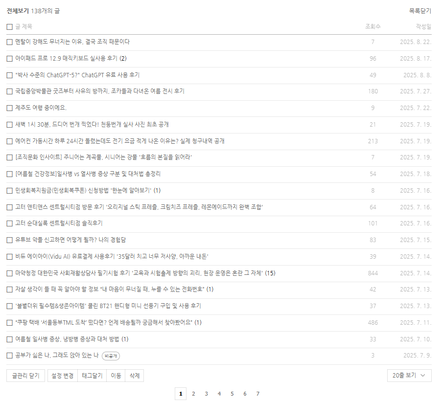 ‘놀면 뭐하니’ 카테고리 글은 일상 위주인데, 이조차도 글 하나 작성하는 데 2시간은 훌쩍 넘는다. AI가 글을 뚝딱 써준다지만, 나는 읽고, 쓰고, 고치고.. 이 과정을 반복하다 보면 시간이 금세 간다.