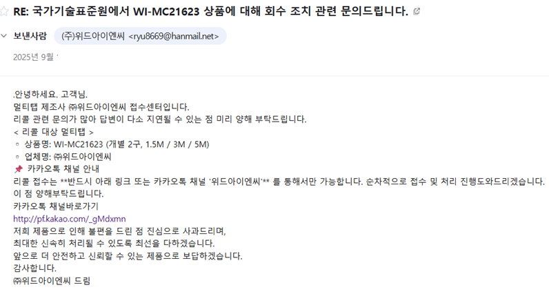 쿠팡에서는 안내 메일만 발송할 뿐, 환불이나 회수 관련 절차는 ㈜금호전기를 통해 진행하라고 적혀 있었습니다. 그래서 바로 구매내역과 제품 사진을 메일로 보냈더니, 곧바로 멀티탭 제조사인 ㈜위드아이앤씨에서 회신이 왔습니다.