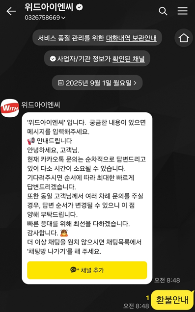 다시 말해, 메일이나 전화로는 접수가 되지 않고, 지정된 링크나 ‘위드아이앤씨’ 카톡 채널을 통해 구매내역과 사진을 업로드해야 했습니다.
