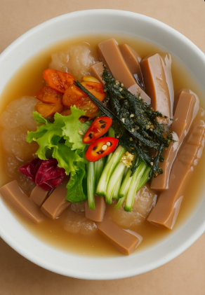 그렇다면 어떻게 먹으면 좋을까요? 가장 간단한 방법은 식초묵사발입니다. 잘게 썬 식초묵에 오이와 파프리카를 곁들여 동치미 육수와 함께 즐기면 상큼하고 시원한 별미가 됩니다.