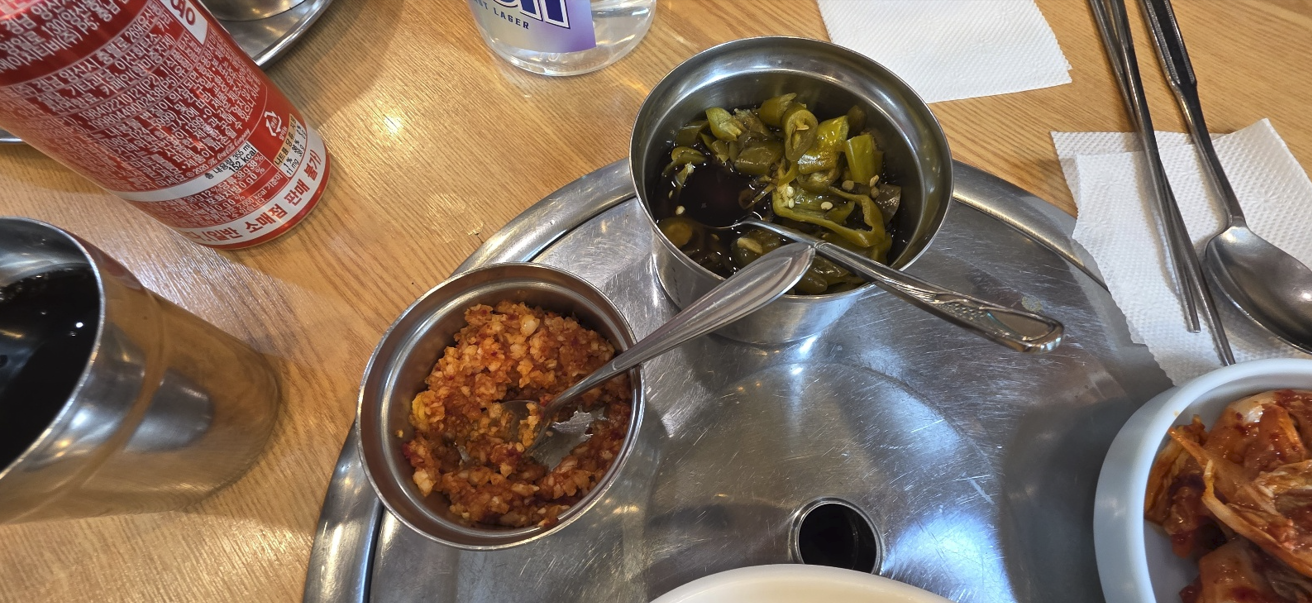 각자 칼국수 한 그릇에 만두는 3알씩 나눠 먹었다. 기본 반찬으로는 배추 겉절이와 단무지가 나왔고, 테이블 위에는 다진 마늘에 양념을 버무린 것과 고추 간장 절임으로 보이는 통이 함께 놓여 있었다.