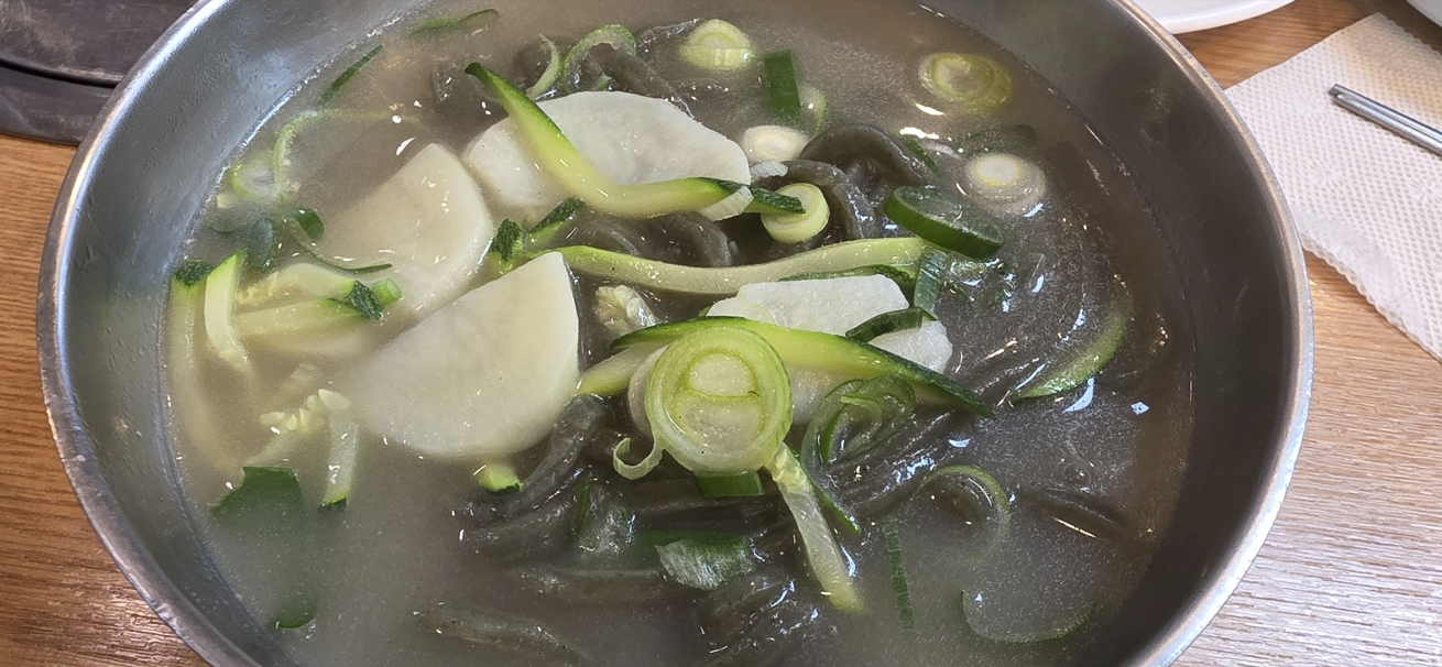 칼국수 면은 색깔부터 확실히 달랐다. 칡이 들어간 면이라 전체적으로 어두운 색감이었고, 손칼국수임에도 불구하고 면 굵기가 전반적으로 고른 편이었다. 손으로 뽑은 면 특유의 들쭉날쭉함보다는, 일정한 식감에 가까웠다.