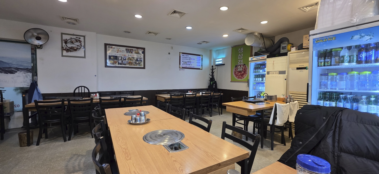 입구를 기준으로 좌측 테이블 위 형광등은 꺼져 있었고, 중앙과 우측 테이블 쪽에만 손님들이 앉아 있었다. 우측은 또 다른 출입구가 있는 방향이라 동선이 그쪽으로 자연스럽게 모이는 느낌이었다. 전체적으로는 한 타임이 정리되고, 브레이크타임을 앞둔 분위기였다.