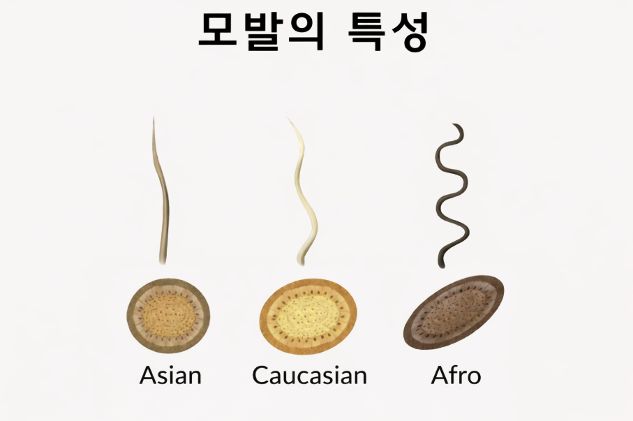 한국인을 포함한 동아시아인의 모발은 몇 가지 공통된 특징을 가진다.