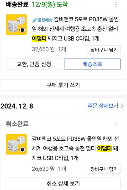 처음엔 판매자 물품으로 구입했는데 배송날짜가 아슬아슬했다. 그래서 로켓 배송으로 재주문했다. 판매자 물품보다 6천원 더 비쌌던 거 같다. 하지만 난 배송날짜가 더 중요했기 때문에 몇천 원의 값을 더 치렀다.