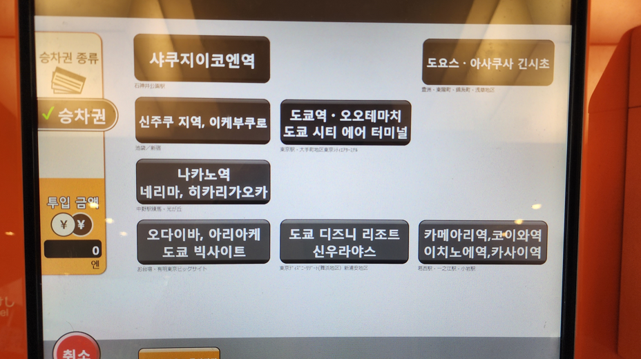 몇 층인지 기억도 안 나지만 다시 올라왔다. 내려서 바로 보이는 발권기로 갔다. 한참 씨름을 했다. 보인다는 사람도 안 보였다. 한국번역으로 계속 눌러도 목적지 타치카와는 보이지 않았다. 욕이 절로 나왔다.