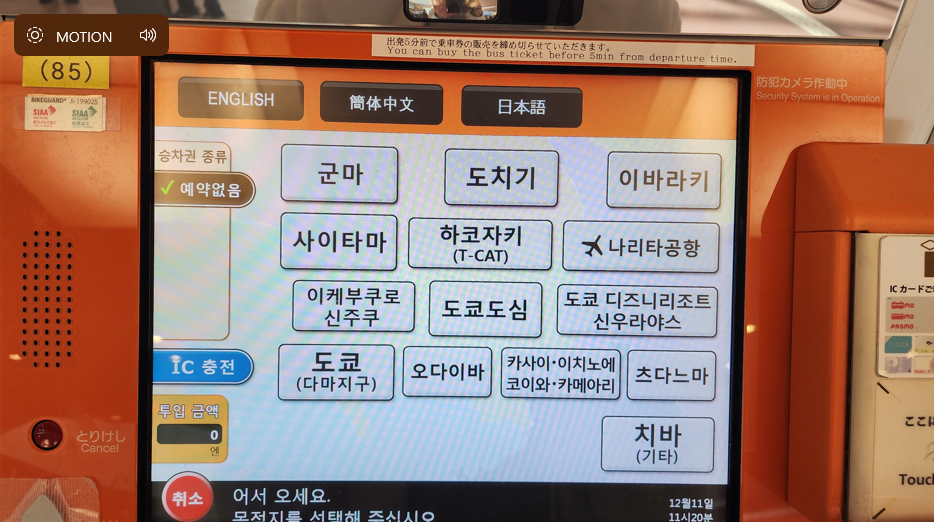 첫 번째. 직원이 보이는 곳 발권기에 가서 파파고로 "타치카와 공항버스 티켓 주세요" 보여줬더니 손으로 크게 X를 그린다.