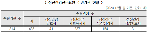 정신질환자 및 국민의 정신건강증진을 위하여 간호사, 사회복지사, 임상심리사, 작업치료사 등 다양한 영역의 전문가 양성이 필요함에 따라 정신건강전문요원 수련기관을 지정하여 양성하고 있음