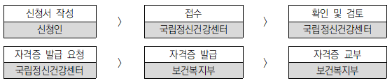 ● 전문요원의 자격증을 발급받으려는 사람은 증빙서류를 포함한 자격증 발급신청서를 국립정신건강센터장에게 제출