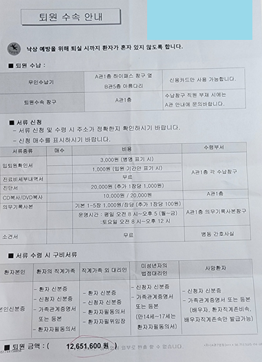 퇴원 수속 안내 간호사쌤이 주신건지.. 퇴원계에서 받은건지 잘 모르겠음. 기분이 너무 들떠서 잘 기억 나지 않음