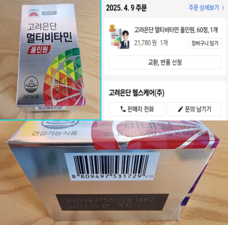 4/10(목) 쿠팡으로 고려은단 멀티비타민 올인원을 구입했습니다. 다행인 건지 구입 후 한 알도 먹지 않은 상태입니다.