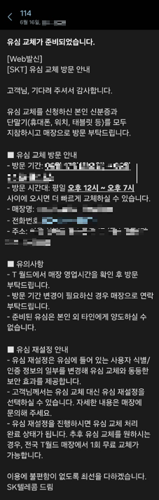 "안녕하세요. n년차 전문요원입니다." 오늘은 SK텔레콤 유심 교체 후기에 대해 떠들어 재껴 보겠습니다. 6/16(월) 13시쯤 유심 교체 예약을 했습니다.예약 후 안내 문자를 받았습니다. 6/16(월) 17시쯤 대리점 방문 안내 문자를 받았습니다.방문 기간은 예약일 기준 7일 6/17(화) 17시쯤 대리점으로 갔습니다.대기 없이 바로 유심 교체 받을 수 있었습니다.교체 한 유심을 돌려주십니다. 버릴 땐 개인정보가 있으니 가위로 잘라서 버리라는 당부 말씀도~ 유심 교체 시간 3분 걸렸나?? 그렇게 눈누난나 대리점을 나왔습니다. 유심을 교체하고 다이소에 들러 삼성 페이로 결제하는 순간 당황했습니다.유심만 바꾸고 들어올 생각에 지갑을 챙기지 않았었는데 삼성페이 재등록하라고??순간 머리가 하얘지더라고요~ ..